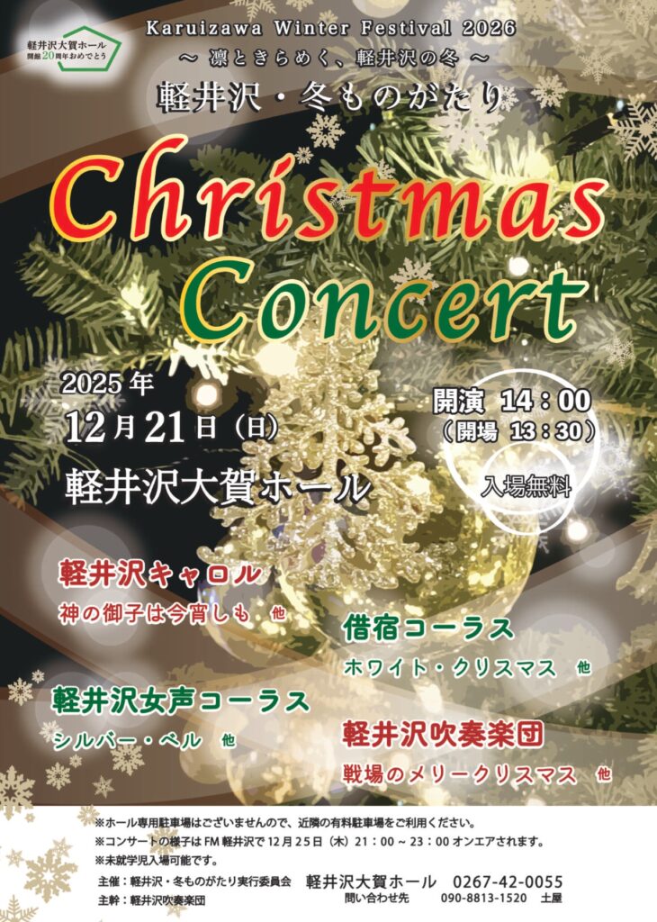 ホームNEWS軽井沢冬ものがたりクリスマスコンサート 12/21 2025年11月25日 街を彩るイルミネーション。 軽井沢で過ごすクリスマスは特別ですね。 12月21日(日)は軽井沢大賀ホールでクリスマスコンサートが行われます。 入場無料です。 是非、ご家族でお楽しみください。 【FM軽井沢では12月25日(木) 21:00~23:00 特別番組を放送します】 軽井沢冬ものがたりクリスマスコンサート 12/21